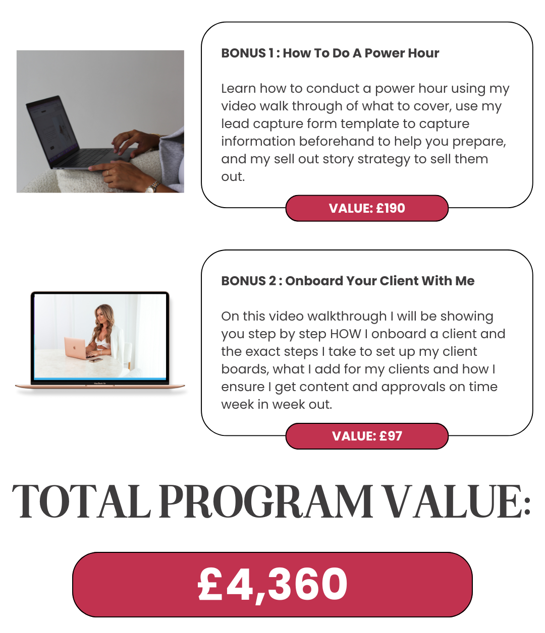 What this program does do is teach you my tried and tested strategies, processes and ways of scaling your business. Not by using someone else's hack, but by learning HOW to do it yourself with access to all the lessons, resources and tools to get you there so you can apply it to your business AND your clients.