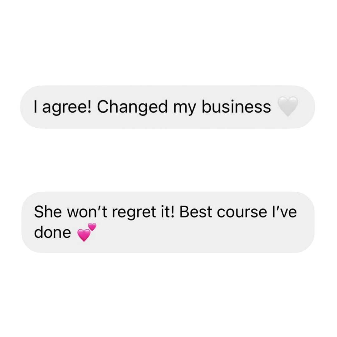 “The way that you literally went above and beyond in the materials, the resources, the recordings and everything you provided, it was full of so much value and things I still need to implement. I honestly think you over delivered and exceeded my expectations 2000%. It’s the BEST investment I’ve ever made. Changing the way I work, having systems in place, confidence has soared, getting rid of lower paying clients, amazing packages.”
